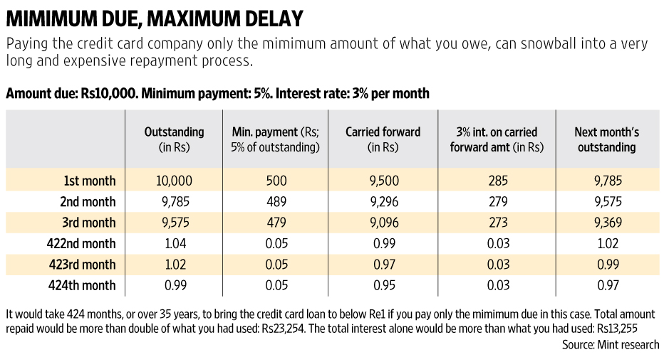 However, some consumers may find it attractive that they need to pay only the minimum balance on a credit card each month, instead of the entire outstanding. But this would lead to a debt trap. There are credit cards that charge interest at 3% per month on outstanding amounts. If you have an outstanding of Rs10,000 on such a card and decide to repay only the minimum outstanding, 5%, each month then it would take you over 35 years to bring the outstanding amount to below Rs1. In this time, you would have spent over Rs13,000 in interest payments alone. This is assuming that no more spends are done on this card.